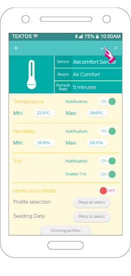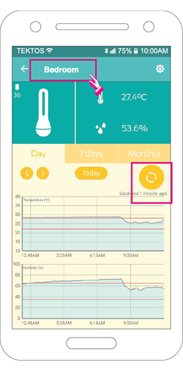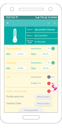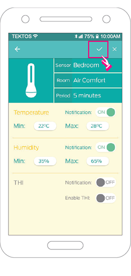 When app is in background and the auto download is enabled from Menu page: the user will receive a notification on Home screen if the temperature or humidity exceeds the acceptable range set.